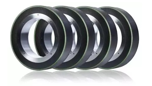 對于這些有高性能要求的磨削應(yīng)用,使用自重輕的復(fù)合纖維基體是一個(gè)解決方案。這些碳纖維復(fù)合材料的優(yōu)點(diǎn)是高比強(qiáng)度和低密度相結(jié)合,相對于鋼基體,完美解決了砂輪基體過重的弊端。碳纖維基體的CBN砂輪(見下圖)已經(jīng)廣泛應(yīng)用于各種曲軸加工或齒輪軸加工,當(dāng)客戶需要大直徑的砂輪,或者需要使用多個(gè)平行砂輪組合拼裝使用時(shí),例如無心磨工藝,碳纖維基體的CBN砂輪就會是一個(gè)優(yōu)選方案。