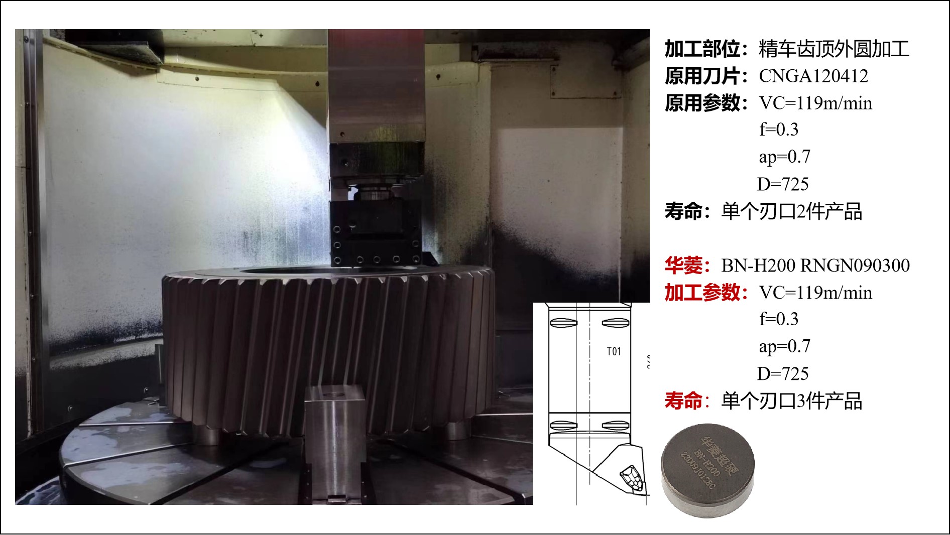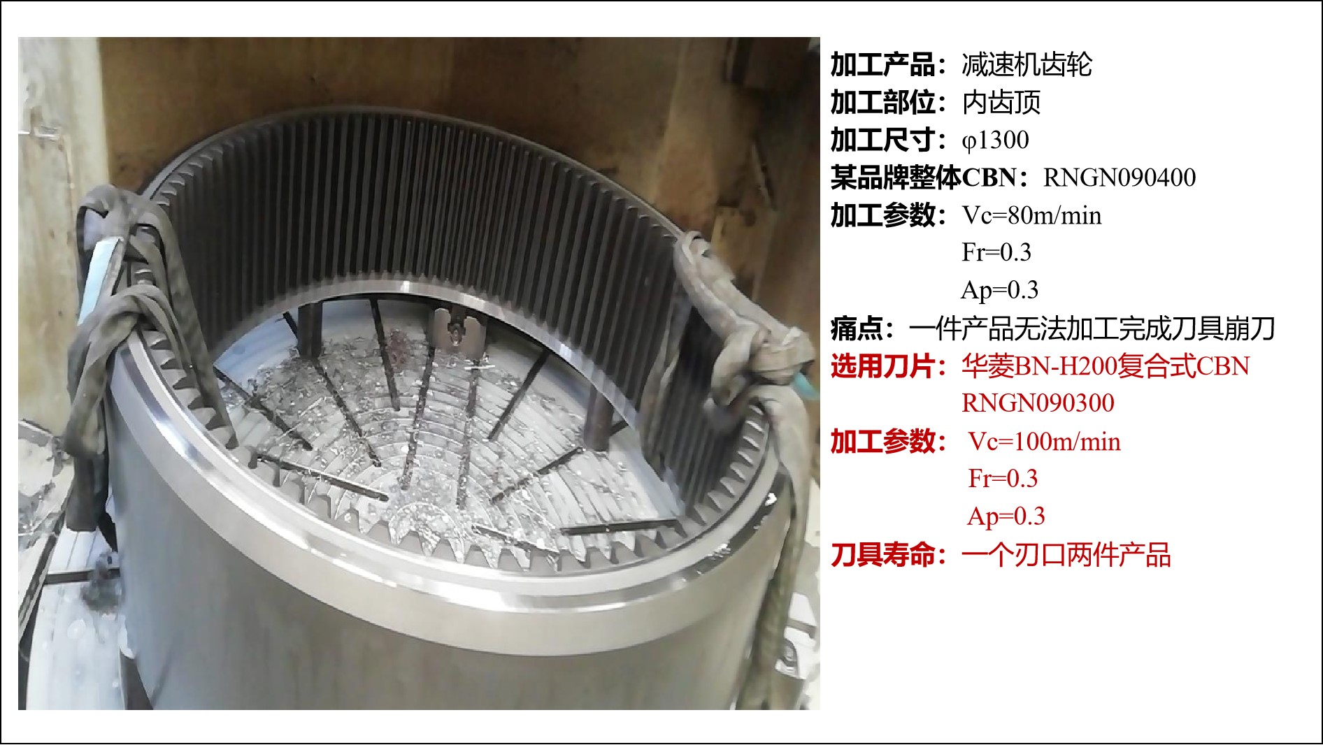 (1)風電齒輪外圈加工案例:加工的產品是風電減速機齒輪的內齒頂,直徑達到1300mm。工件尺寸很大,客戶原來使用的其他品牌的整體RNGN090400的CBN刀片,不僅導致崩刀問題,而且一件產品無法加工完成。華菱推薦使用BN-H200復合式RNGN090300的CBN刀片,并調整加工參數后,驚喜地發現,一個刃口可以至少加工兩件產品!